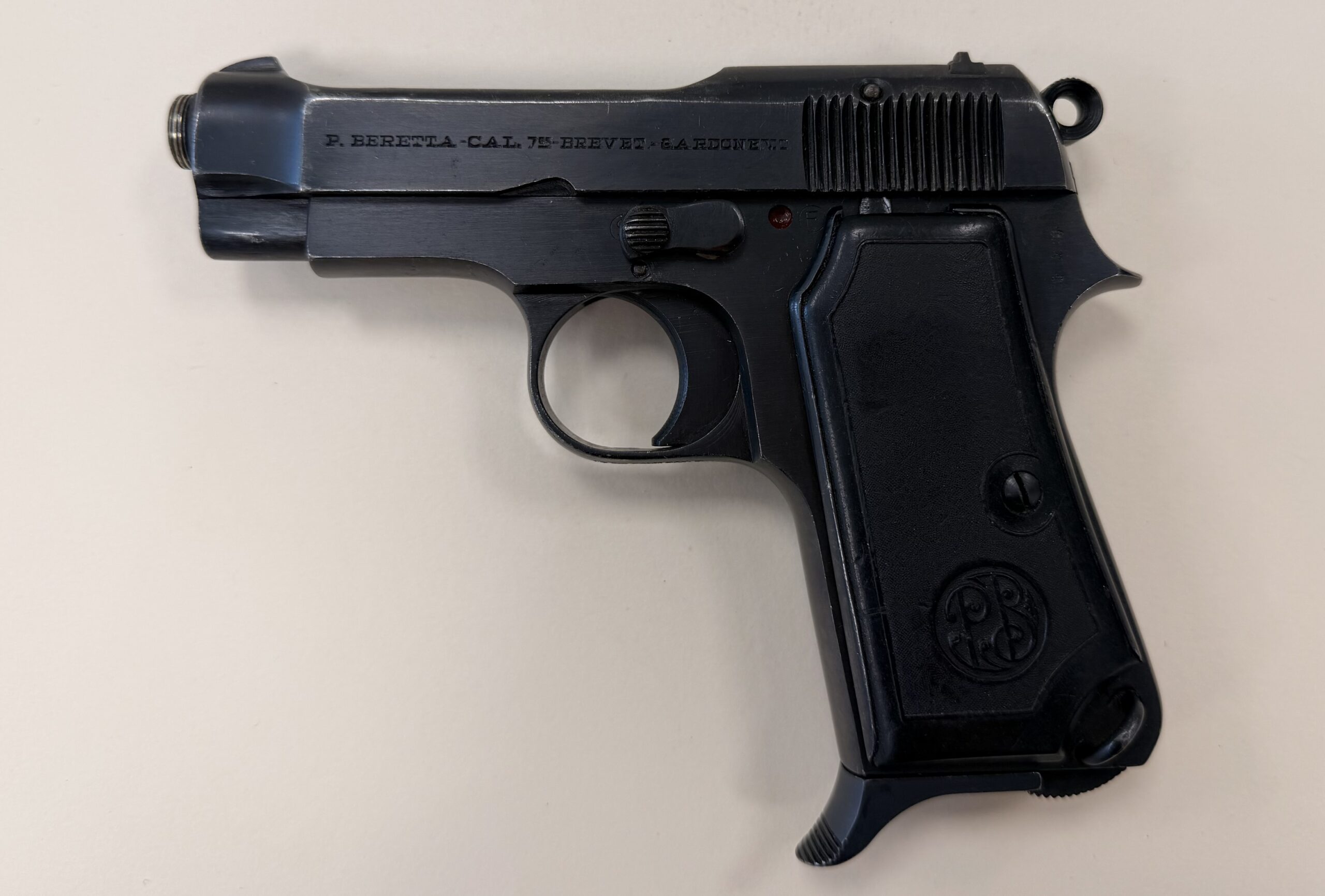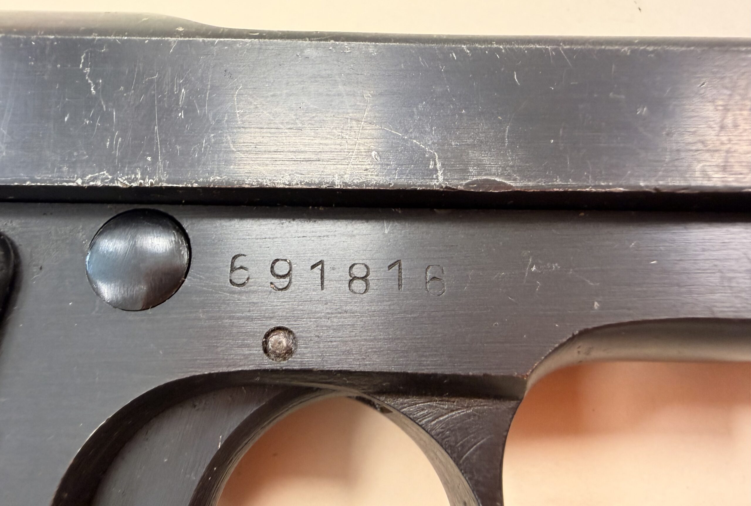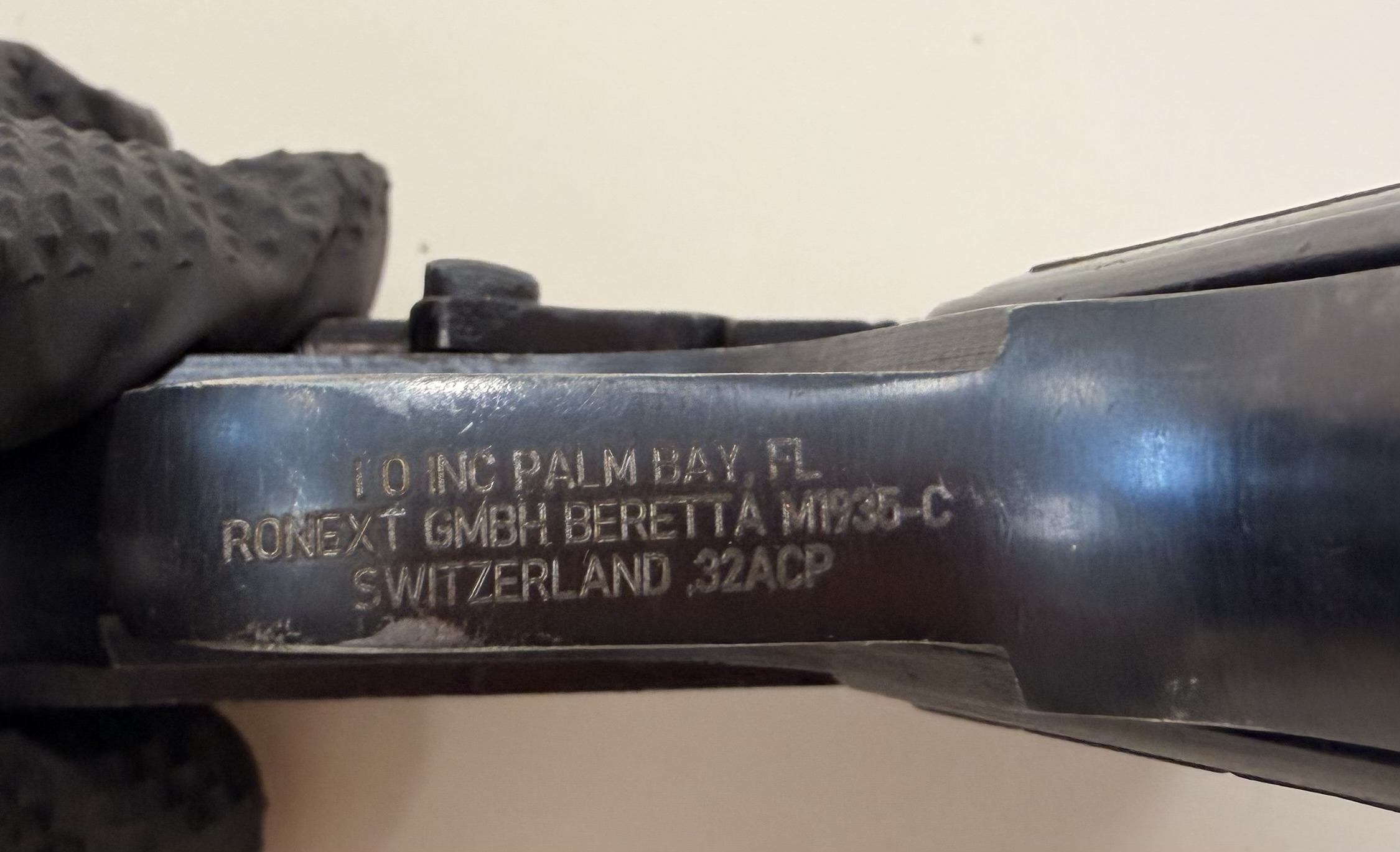 Offered here is a classic Beretta M1935, featuring its original threaded barrel. The pistol is in good overall condition, showing light surface wear consistent with age and use. The grips remain in very good condition, and the bore is good, though it would benefit from a light cleaning.
