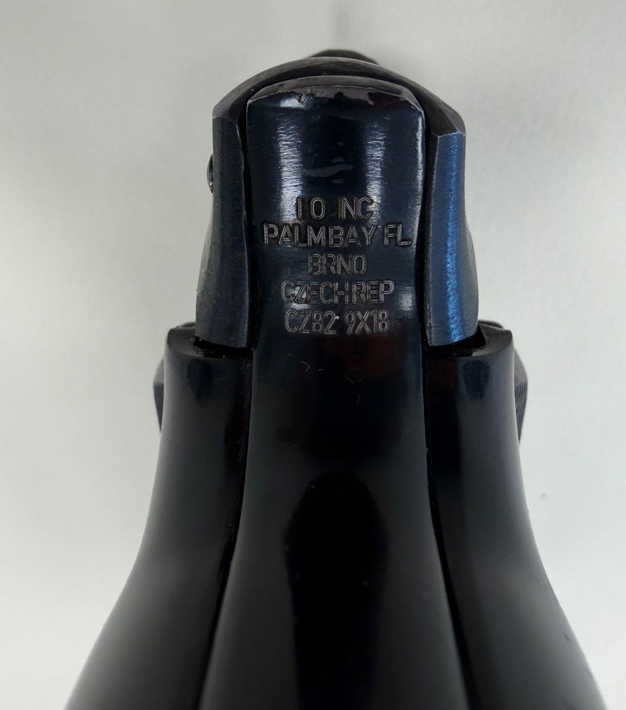 CZ82 Pistol with FREE original leather holster, 9×18 Makarov. This pistol is in very good condition. The grips are also in very good condition with no cracks. The bore is in very good condition. The pistol is numbers matching frame and slide.The pistol is 100% functional and comes with one 12 round magazine. The pistol is import marked on the rear strap underneath the hammer on the frame.