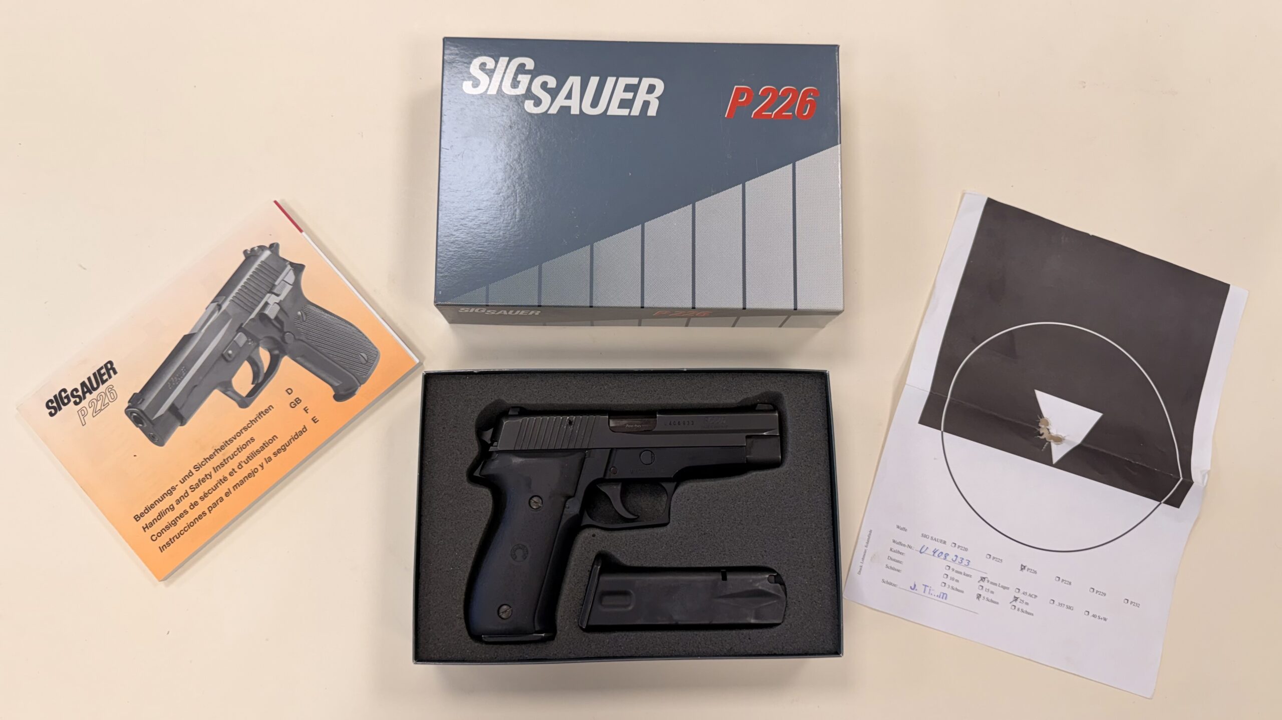 We’ve just received German SIG Sauer P226 in 9mm Parabellum / 9x19mm with the factory original box, Serial Number U408933.